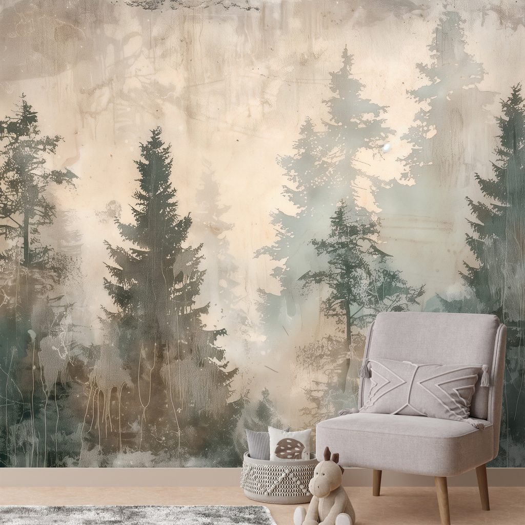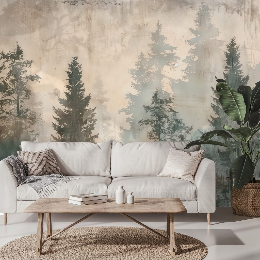 Tapet autoadeziv ceață de pădure în tonuri pastelate